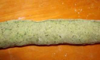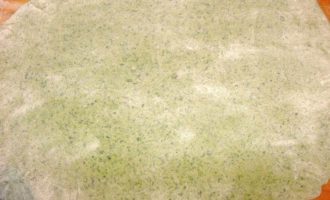 От теста отрезать кусочек и раскатать как можно тоньше. Впрочем может кто любит и потолще, будет сытнее, но грубее.