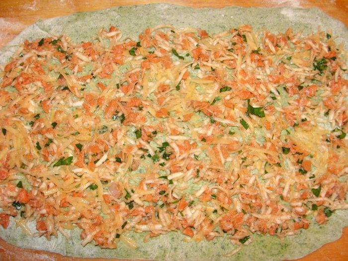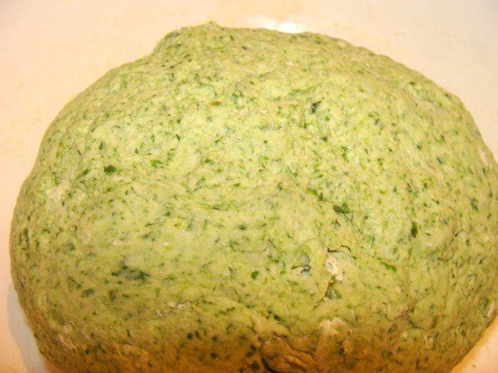 Тесто у нас абсолютно постное. Муку просеять, высыпать горкой, посолить. Сделать углубление, вылить размороженную шпинатную смесь (400 г). Добавить 50мл оливкового масла. Замесить мягкое тесто. По мере надобности муки можно чуть чуть добавить.