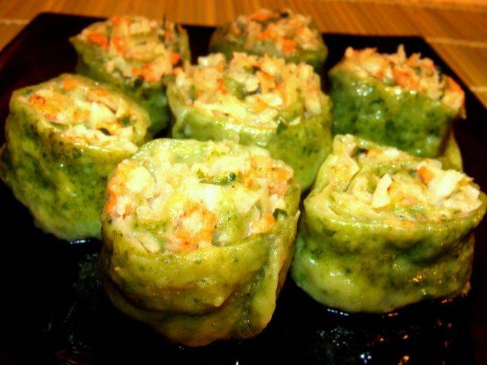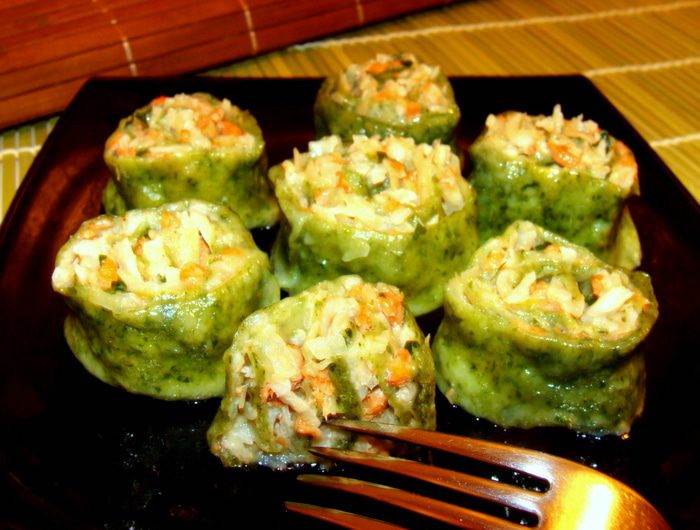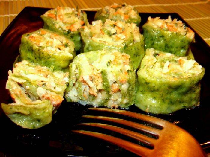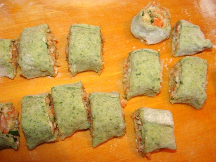 Для последующих порций воду в сковороду нужно каждый раз добавлять. Стебли оставляем на месте до последней порции, потом выбрасываем. У меня получилось 5 роллов и 7 порций из них. Еще одна порция пасты.