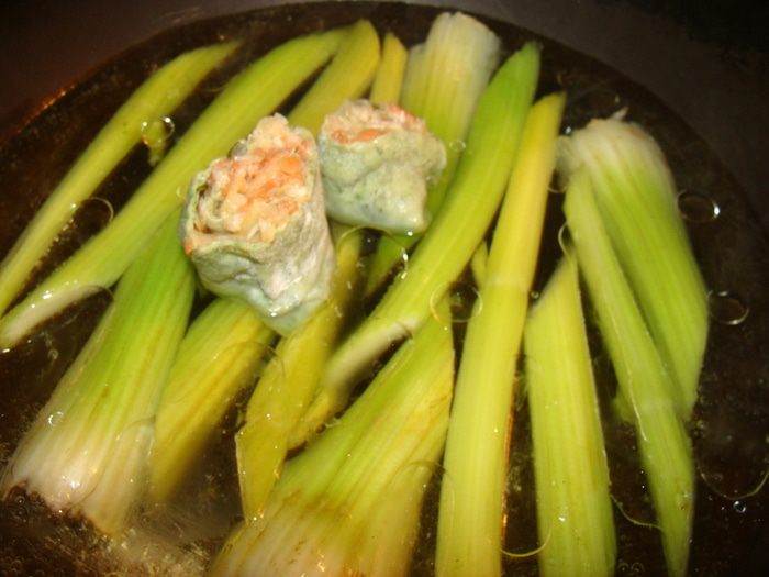 Залить водой, закипятить, чуть присолить и влить оставшееся оливковое масло. Роллы должны быть покрыты водой на 2/3. тушить на довольно сильном огне 10 минут.