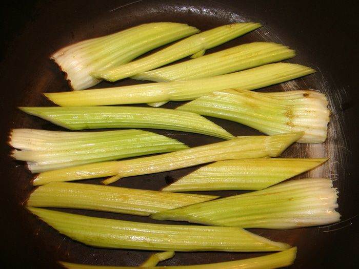 В глубокую сковороду выложить стебли сельдерея. Они не датут роллам пристыть ко дну и усилят вкус!