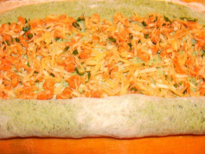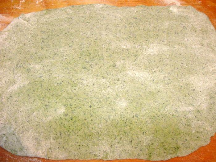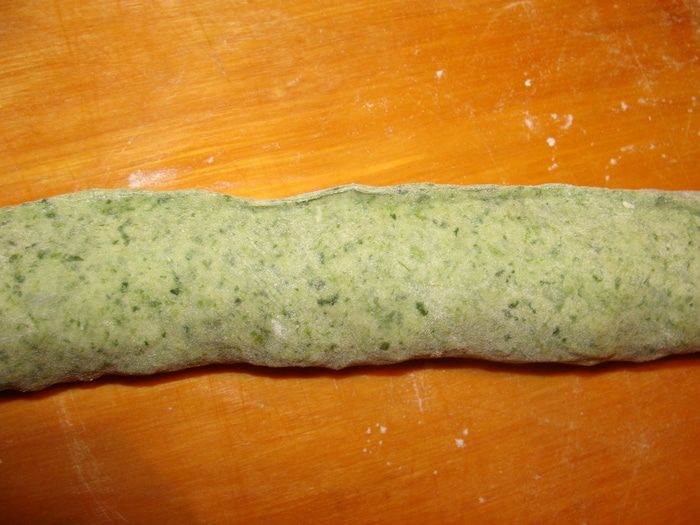 От теста отрезать кусочек и раскатать как можно тоньше. Впрочем может кто любит и потолще, будет сытнее, но грубее.