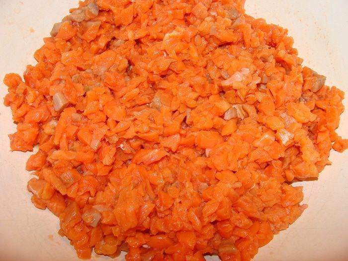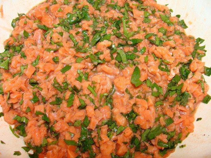 Семгу отделить от костей, мелко нарубить! Именно нарубить ножом, чтобы сохранились кусочки.
