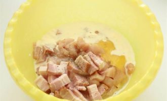 Добавляем к нему рубленый бекон и яйцо. Солим и перчим. Вливаем сливки. -