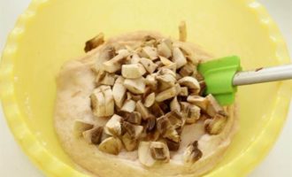Мелко рубим свежие шампиньоны. Добавляем их к фаршу.