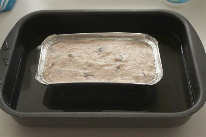 Заполняем форму фаршем. Ставим форму на водяную баню и отправляем запекаться в духовку на 180-200 градусов на час.