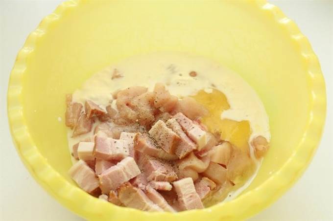 Добавляем к нему рубленый бекон и яйцо. Солим и перчим. Вливаем сливки. -