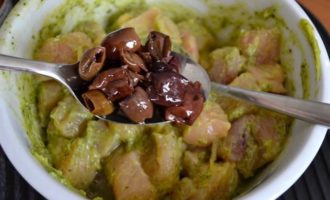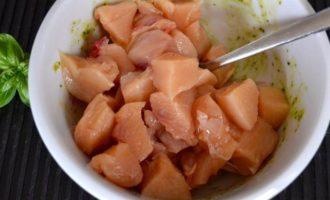 Добавить к кусочкам курицы песто, яичный белок и столовую ложку оливок (лучше всего сорта taggiasche — они обладают более ярким вкусом). Перемешать все.