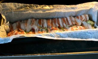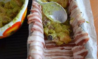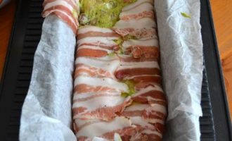 Форму для кексов выложить пекарской бумагой, предварительно смоченной водой и как следует отжатой. Выложить всю форму полосками бекона (грудинки).