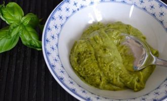 Приготовить соус песто. Листья базилика осторожно вымыть и осушить. Стараться не помять! Поврежденные листья базилика выделяют эфирные масла и темнеют. Соответственно, цвет у песто получится темно-зеленого цвета и он приобретет травянистый вкус!
