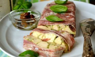 Выпекать в разогретой духовке на водяной бане в течение 50 минут. Готовый террин достать из духовки, дать остыть и выложить на сервировочное блюдо.