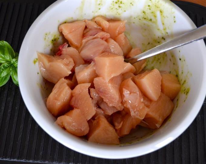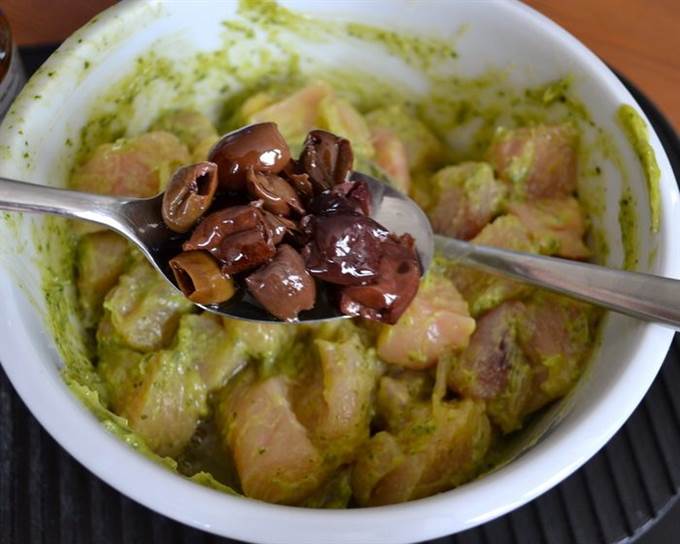 Добавить к кусочкам курицы песто, яичный белок и столовую ложку оливок (лучше всего сорта taggiasche — они обладают более ярким вкусом). Перемешать все.