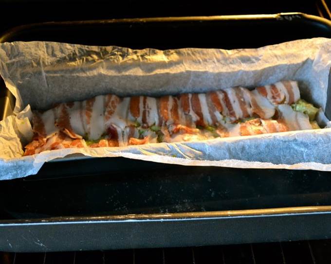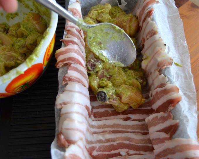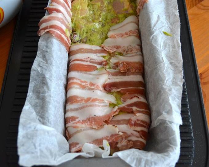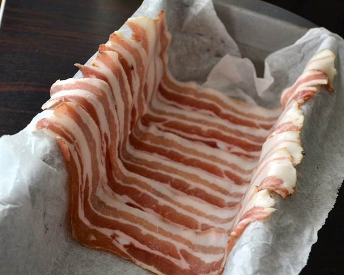 Форму для кексов выложить пекарской бумагой, предварительно смоченной водой и как следует отжатой. Выложить всю форму полосками бекона (грудинки).