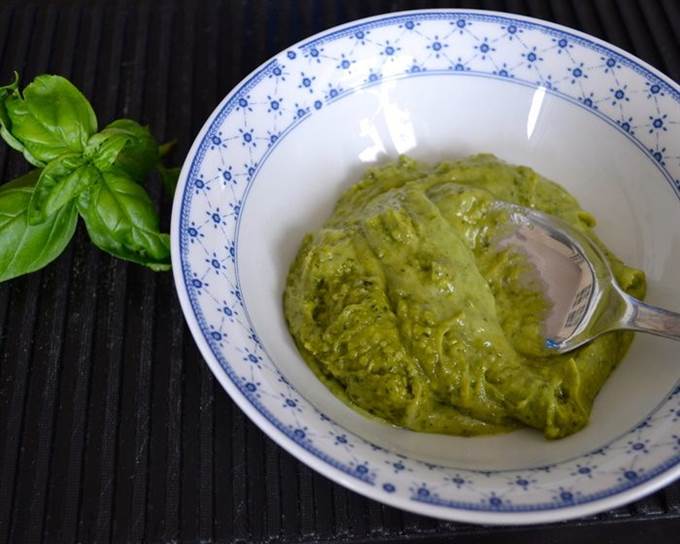 Приготовить соус песто. Листья базилика осторожно вымыть и осушить. Стараться не помять! Поврежденные листья базилика выделяют эфирные масла и темнеют. Соответственно, цвет у песто получится темно-зеленого цвета и он приобретет травянистый вкус!