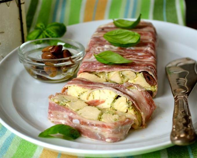 Выпекать в разогретой духовке на водяной бане в течение 50 минут. Готовый террин достать из духовки, дать остыть и выложить на сервировочное блюдо.