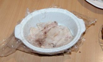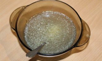 Бульон, в котором варилась рулька, процедить, поперчить, посолить. Добавить желатин (согласно инструкции). На 400 г бульона и 1 ч.л. желатина.