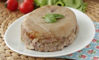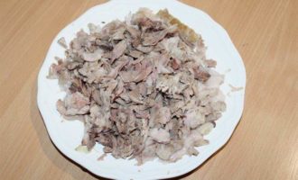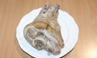 Остывшую рульку разобрать руками, отделить мясо от костей и кожи. Удалить лишний жир, темные прожилки. Мелко нарезать мясо.