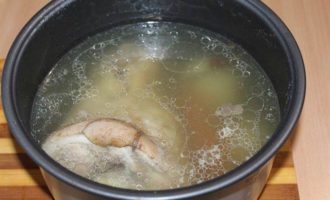 Бульон посолить. Оставить рульку остывать в бульоне для сочности.