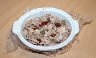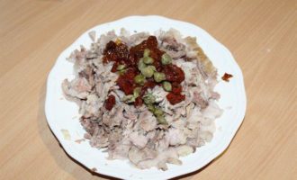 Порезать вяленые томаты, добавить к мясу каперсы. Посолить, поперчить по вкусу. Хорошо все перемешать.