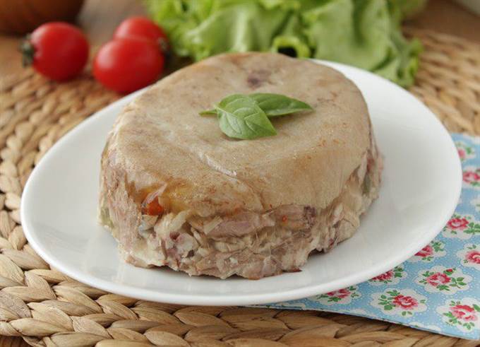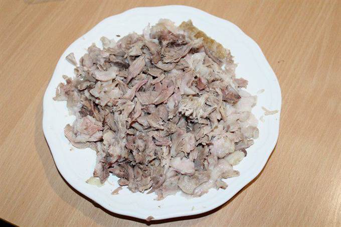 Остывшую рульку разобрать руками, отделить мясо от костей и кожи. Удалить лишний жир, темные прожилки. Мелко нарезать мясо.