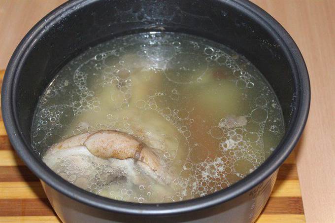 Бульон посолить. Оставить рульку остывать в бульоне для сочности.