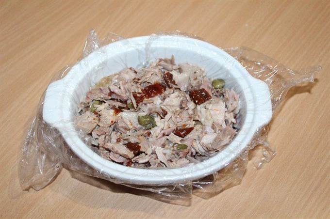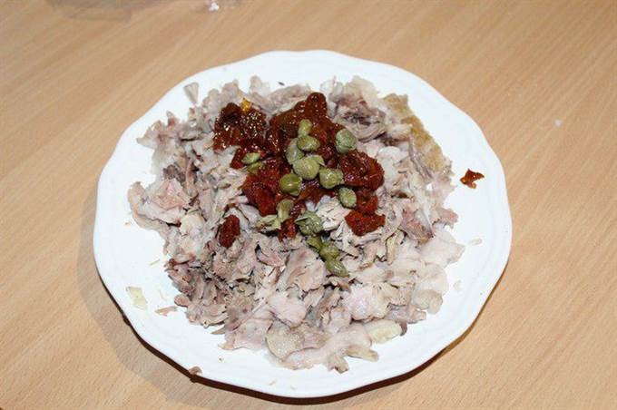 Порезать вяленые томаты, добавить к мясу каперсы. Посолить, поперчить по вкусу. Хорошо все перемешать.