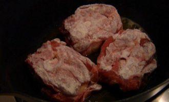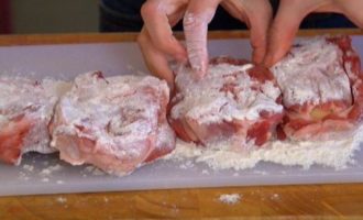 Мясо вымыть, просушить салфеткой и обвалять со всех сторон в муке.