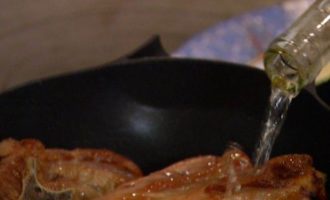 Вернуть мясо в кастрюлю, перемешать, влить вино и дать алкоголю выпариться.