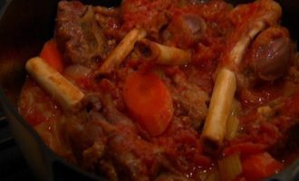 Добавить к мясу помидоры в собственном соку, накрыть крышкой и отправить в разогретую духовку на 2-2 1/2 часа.
