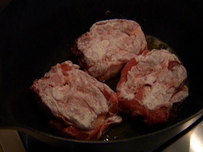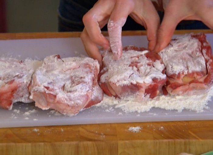Мясо вымыть, просушить салфеткой и обвалять со всех сторон в муке.