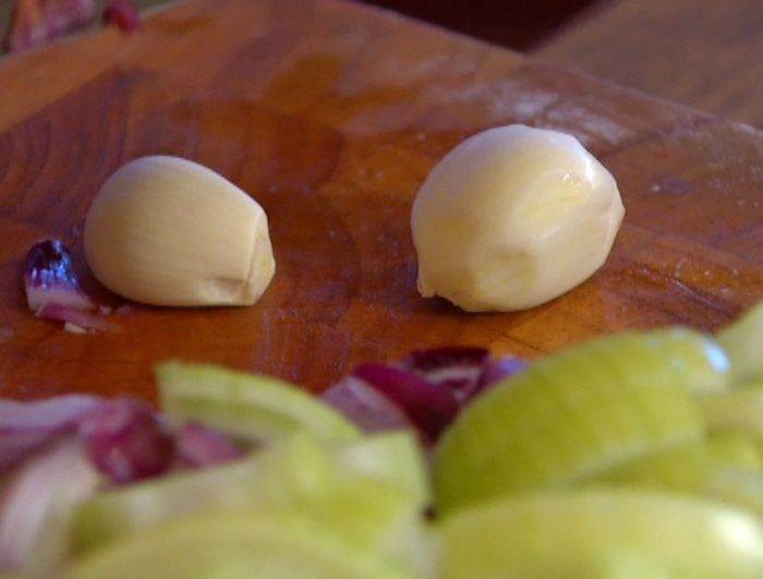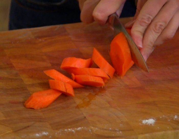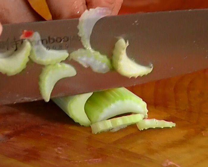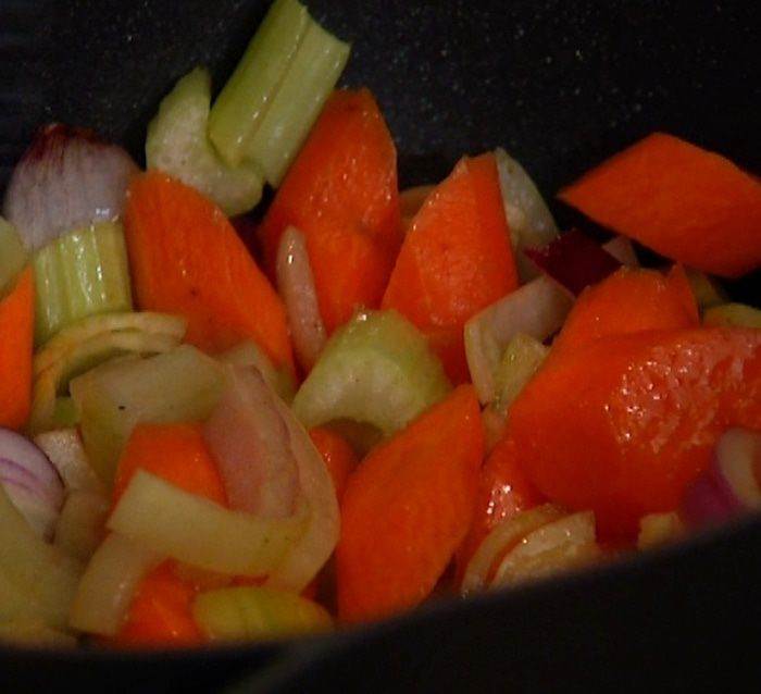 Обжаренное мясо переложить на тарелку, а в кастрюлю, где жарилось мясо, выложить морковь, лук, сельдерей и чеснок, добавить 1 ч. ложку соли, поперчить и готовить 5-10 минут.