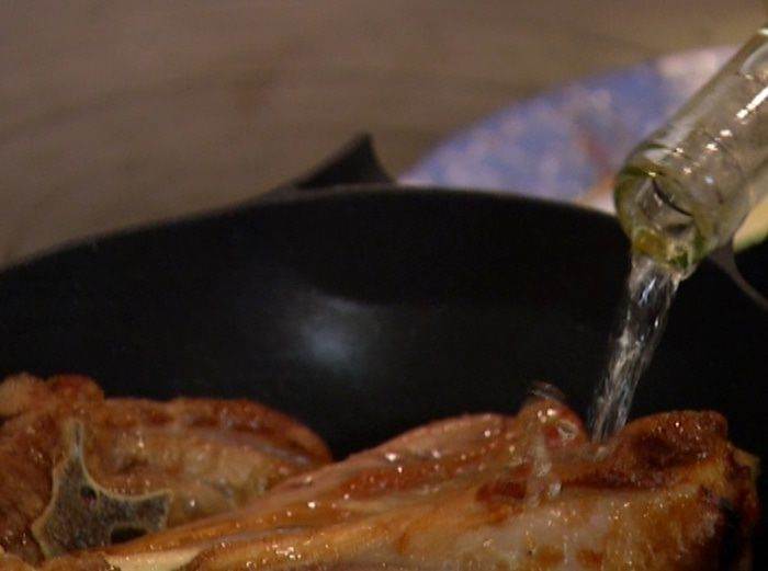 Вернуть мясо в кастрюлю, перемешать, влить вино и дать алкоголю выпариться.