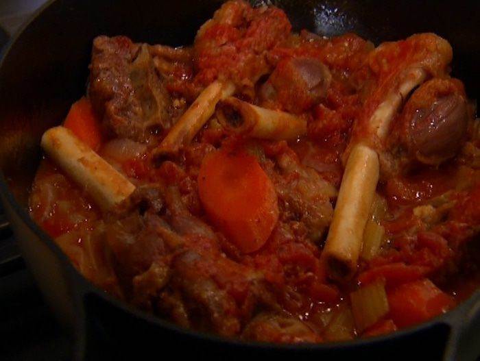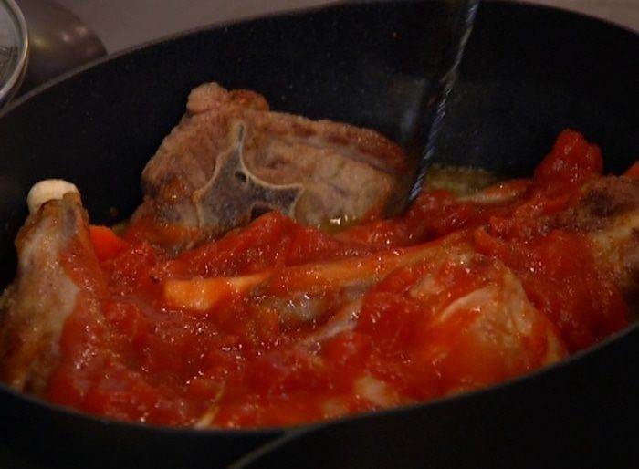 Добавить к мясу помидоры в собственном соку, накрыть крышкой и отправить в разогретую духовку на 2-2 1/2 часа.