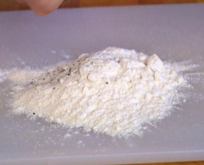 Муку высыпать на рабочую поверхность, добавить 1 ч. ложку соли и щепотку перца, все перемешать.