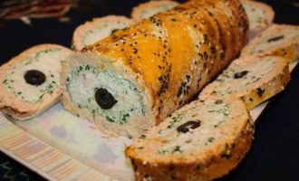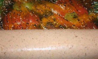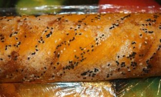 Разворачиваем рулет. Пленку посыпаем куркумой, паприкой, кунжутными семечками (белые и черные) и обваливаем во всем этом рулет.