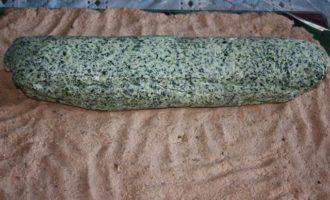 Пока первый слой застывает, выкладываем второй слой рулета — это майонез с петрушкой. Разровнять, выложить первый рулет и завернуть. Отправляем в холод.