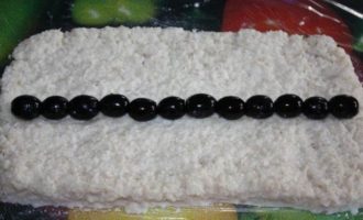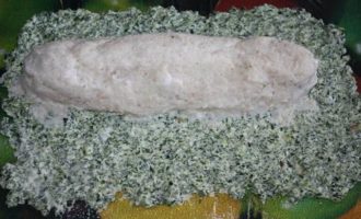 По 5 ст.л. майонеза с желатином добавить к горбуше и хеку. Петрушку добавить к оставшемуся майонезу. Все порции хорошо перемешать. На пищевую пленку выкладываем первый слой рыбы. Это хек. Разровнять и выложить маслины. Завернуть в рулет. Отравляем в холод для застывания.