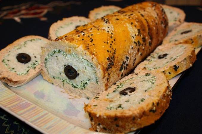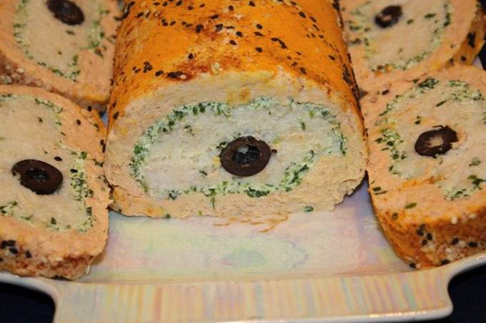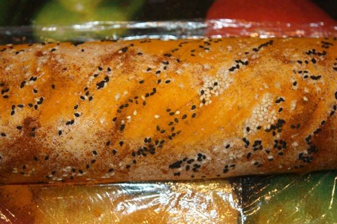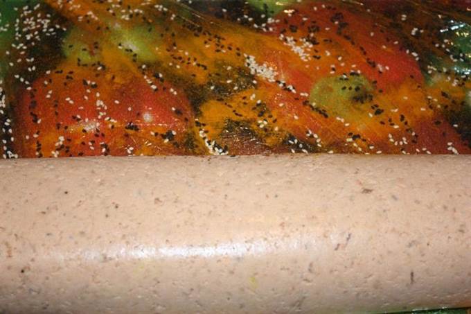 Разворачиваем рулет. Пленку посыпаем куркумой, паприкой, кунжутными семечками (белые и черные) и обваливаем во всем этом рулет.