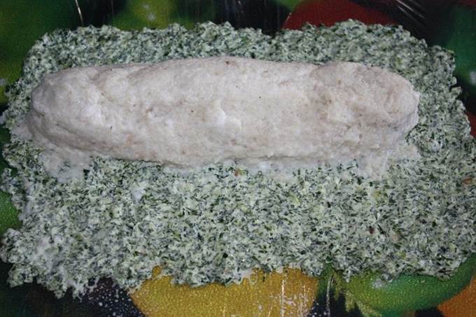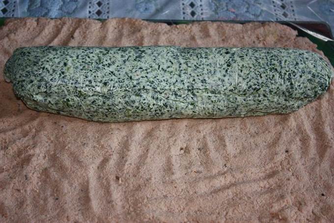 Пока первый слой застывает, выкладываем второй слой рулета — это майонез с петрушкой. Разровнять, выложить первый рулет и завернуть. Отправляем в холод.