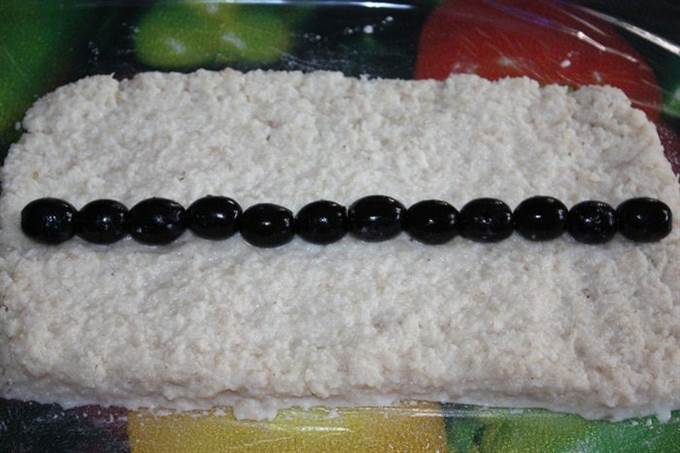 По 5 ст.л. майонеза с желатином добавить к горбуше и хеку. Петрушку добавить к оставшемуся майонезу. Все порции хорошо перемешать. На пищевую пленку выкладываем первый слой рыбы. Это хек. Разровнять и выложить маслины. Завернуть в рулет. Отравляем в холод для застывания.