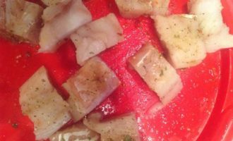Треску разморозить, порезать на кусочки шириной 5 см, посолить, поперчить.