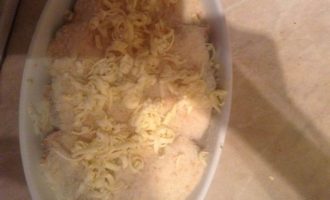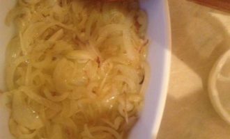 Лук порезать полукольцами, поджарить до золотистого цвета. Выложить в огнеупорную форму.