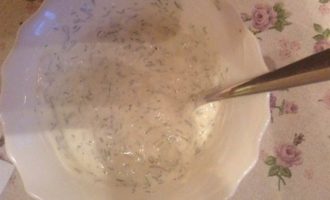 В сметану мелко порубить чеснок, укроп, посолить, поперчить.