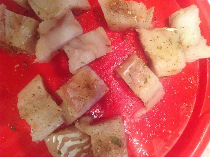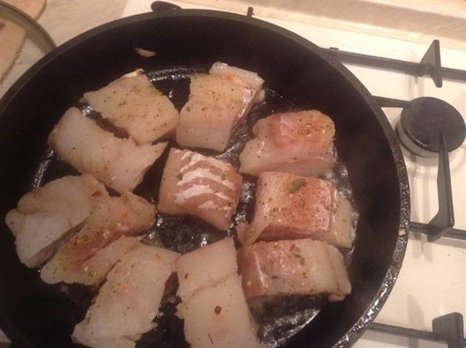 Треску разморозить, порезать на кусочки шириной 5 см, посолить, поперчить.