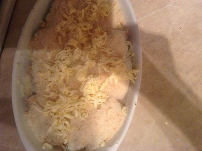 На подушку из лука выкладываем рыбу, поливаем её сметанной заправкой, сверху посыпаем сухарями. Холодное сливочное масло натереть на терке поверх сухарей. Отправить в разогретую до 200 градусов духовку на 10-12 мин.
