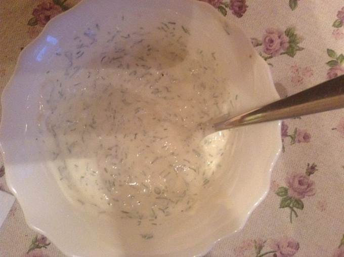 В сметану мелко порубить чеснок, укроп, посолить, поперчить.
