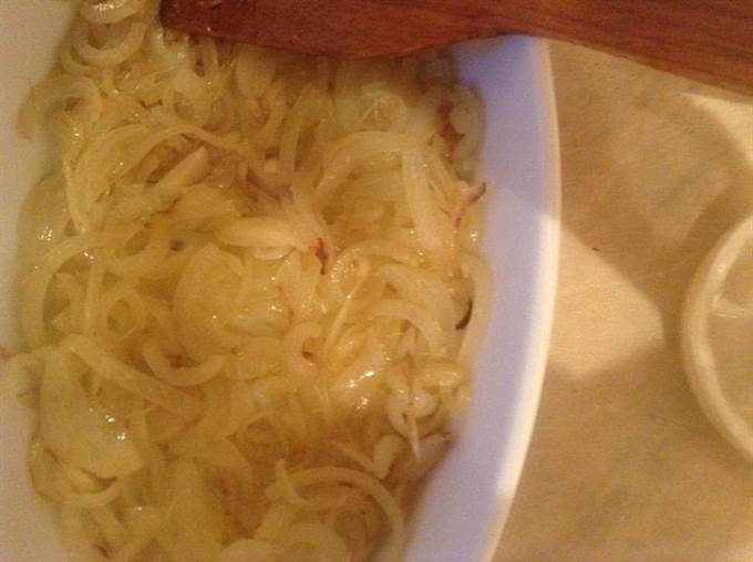 Лук порезать полукольцами, поджарить до золотистого цвета. Выложить в огнеупорную форму.