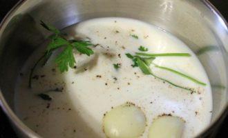 • Молоко налить в ковш, к нему добавить соль, перец, мускатный орех, петрушку и лук порезанный крупным кубиком. (на фото две четвертинки лука, это я погорячилась, потом пришлось доставать и резать его мельче.) Медленно доводим до кипения, варим 1 минуту, снимаем с огня, накрываем крышкой и даем настояться 30 минут.