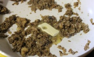 • Займемся теперь грибами. У меня были крупные шампиньоны. Два из них натираем на мелкой терке, кладем в сковороду, добавляем масло и тушим до испарения жидкости. Оставшийся гриб нарезать пластинками и обжарить с двух сторон до золотистой корочки. Он пойдет на украшение.