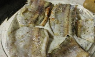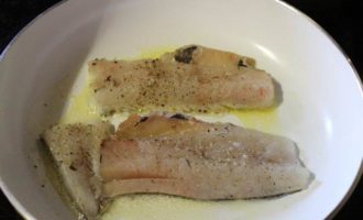 • Разогреть сковороду, добавить масло. Рыбу помыть, обсушить, натереть солью и перцем, и обжарить с двух сторон до легкого зарумянивания.